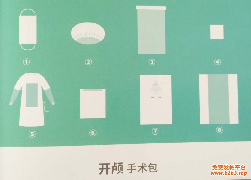 手术包配置:一次性使用医用口罩1个、一次性使用帽1个、器械盘套1条、擦手巾(40*40cm)4块、一次性使用手术衣(加强型)2件、边单2条、开颅手术单1条、一次性使用包布1条。