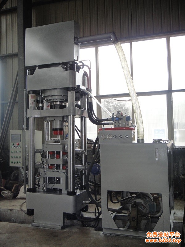 硅粉粉末成型液压机上下横梁由立柱和螺母联接,主液压缸前端用法兰联接在横梁底部,下模具固定在下横梁上,上模具固定在中滑板上,上下模具均可拆卸和更换,顶缸位于主机下梁的下部,顶缸主要用于压制过程中异步浮动用。充液系统安装在主缸缸底部位,以补充主油缸快速前进所需的油液。